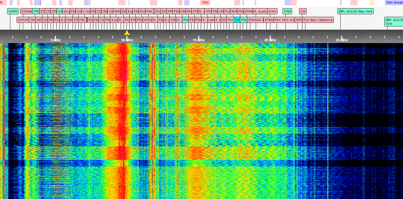 Noisy Waterfall New toy, cheap antenna, and an expensive power supply. (1.5MB png. Noise doesn’t compress well) Viewing the whole 0-30mhz shows some, ugh, noise. Posted on 21. January 2021