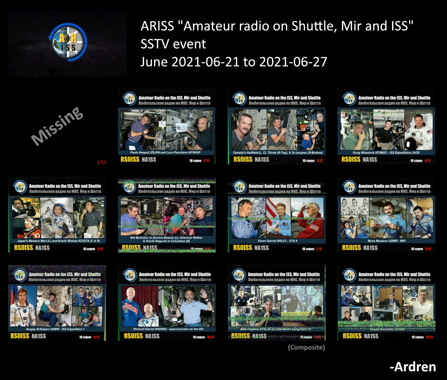 I was able to receive 11 of the 12 images in acceptable quality. Interestingly there must be some funny relationship between the time to send the complete 12 images and and the time is takes for the ISS to orbit the earth as I received a lot of some images, and none or very limited of others.